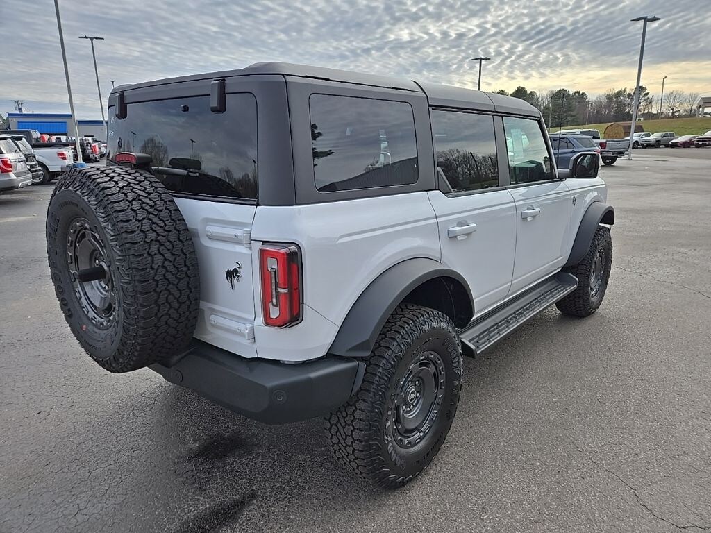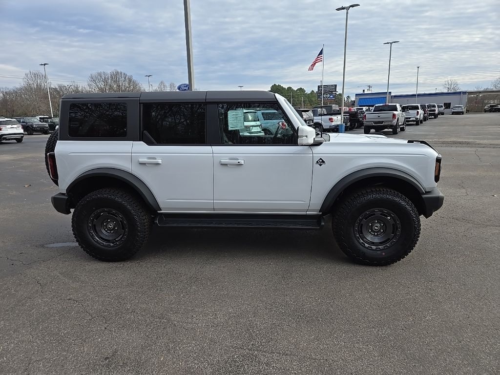 Oxford White 2025 Ford Bronco Outer Banks 4WD 10-Speed Automatic 2.3L EcoBoost I-4 360-Degree Camera, 4-Wheel Disc Brakes, 4.7 Final Drive Ratio, 7 Speakers, ABS brakes, Adaptive Cruise Control, Air Conditioning, Alloy wheels, AM/FM radio: SiriusXM with 360L, AM/FM Stereo, Auto High-beam Headlights, Auto-dimming Rear-View mirror, Automatic temperature control, Brake assist, Compass, Connected Navigation, Delay-off headlights, Driver door bin, Driver vanity mirror, Dual front impact airbags, Dual front side impact airbags, Electronic Stability Control, Emergency communication system: 911 Assist, Equipment Group 314A Lux Package, Evasive Steering Assist, Exterior Parking Camera Rear, Front anti-roll bar, Front Bucket Seats, Front Center Armrest, Front dual zone A/C, Front fog lights, Front Parking Sensors, Front reading lights, Front wheel independent suspension, Fully automatic headlights, Hard Top Sound Deadening Headliner, Heated door mirrors, Heated front seats, Heated Leather-Trimmed/Vinyl Bucket Seats, Heated steering wheel, High Clearance Fender Flares, High Clearance Suspension, Illuminated entry, Information on Demand Panel, Integrated roll-over protection, Leather Shift Knob, Low tire pressure warning, Navigation system: Connected Navigation, Occupant sensing airbag, Outside temperature display, Overhead airbag, Overhead console, Panic alarm, Passenger door bin, Passenger vanity mirror, Position-Sensitive Bilstein Shock Absorbers, Power door mirrors, Power driver seat, Power passenger seat, Power steering, Power windows, Radio data system, Radio: B&O Sound System by Bang & Olufsen, Rear seat center armrest, Rear-Window Defroster & Washer, Remote keyless entry, Sasquatch Package, Security system, Sideview Mirrors, SiriusXM w/360L, Speed control, Split folding rear seat, Steering wheel mounted audio controls, SYNC 4, Tachometer, Telescoping steering wheel, Tilt steering wheel, Traction control, Trip computer, Universal Garage Door Opener, Variably intermittent wipers, Voltmeter, Wheels: 17" Carbonized Gray Painted Aluminum.