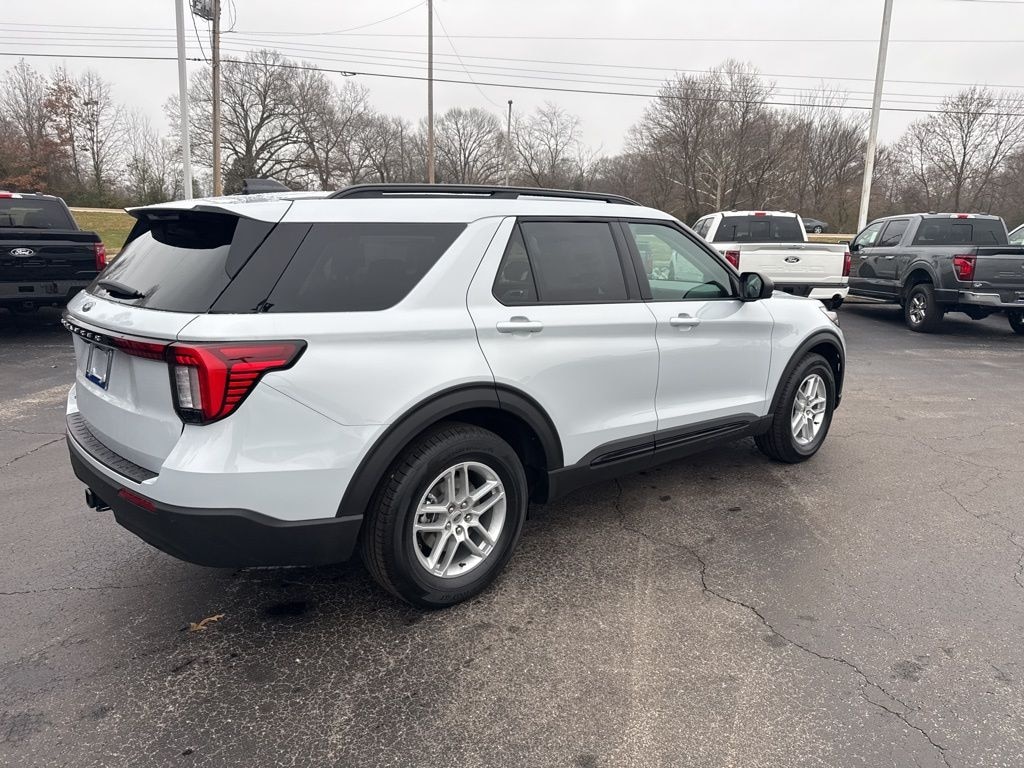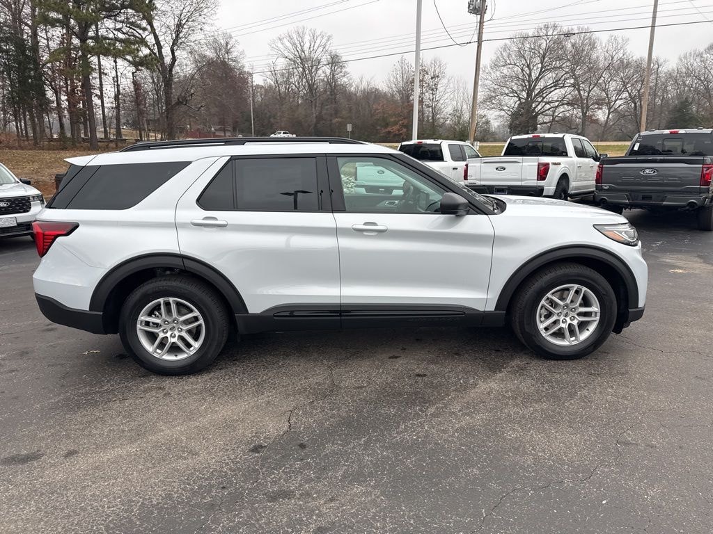 Space White Metallic 2026 Ford Explorer Active RWD 10-Speed Automatic 2.3L EcoBoost I-4 2nd Row 35/30/35 Bench with E-Z Entry and Armrest, 3rd row seats: bench, 4-Wheel Disc Brakes, 6 Speakers, 8 USB Ports, ABS brakes, Active Badging, Active Noise Cancellation, Air Conditioning, Alloy wheels, AM/FM radio: SiriusXM with 360L, AM/FM Stereo, Apple CarPlay/Android Auto, Auto High-beam Headlights, Automatic temperature control, Black Lower Bodyside Cladding with Chrome Accent, Black Roof-Rack Side Rails, Brake assist, Bumpers: body-color, Compass, Delay-off headlights, Driver door bin, Driver vanity mirror, Dual front impact airbags, Dual front side impact airbags, Electronic Stability Control, Emergency communication system: 911 Assist, Equipment Group 200A Standard Package, Exterior Parking Camera Rear, Ford Connectivity Package (one-Time Purchase - 7 Years), Four wheel independent suspension, Front and 2nd Rows Floor Liners with Carper Floor Mats, Front anti-roll bar, Front Bucket Seats, Front Center Armrest, Front dual zone A/C, Front License Plate Bracket, Front reading lights, Fully automatic headlights, Heated door mirrors, Illuminated entry, Internet access capable: FordPass Connect 5G, Knee airbag, Low tire pressure warning, Manual-Folding Sideview Mirrors, Navigation System, Occupant sensing airbag, Outside temperature display, Overhead airbag, Overhead console, Panic alarm, Passenger door bin, Passenger vanity mirror, Power driver seat, Power Liftgate, Power steering, Power windows, Rear air conditioning, Rear anti-roll bar, Rear reading lights, Rear window defroster, Rear window wiper, Remote keyless entry, Security system, Speed control, Speed-sensing steering, Speed-Sensitive Wipers, Split folding rear seat, Spoiler, Steering wheel mounted audio controls, Tachometer, Telescoping steering wheel, Tilt steering wheel, Traction control, Trip computer, Unique Cloth Captain's Chairs, Unique Cloth Heated Captain's Chairs, Variably intermittent wipers, Vinyl-Wrapped Steering Wheel, Wheels: 18" Sparkle Silver-Painted Aluminum.